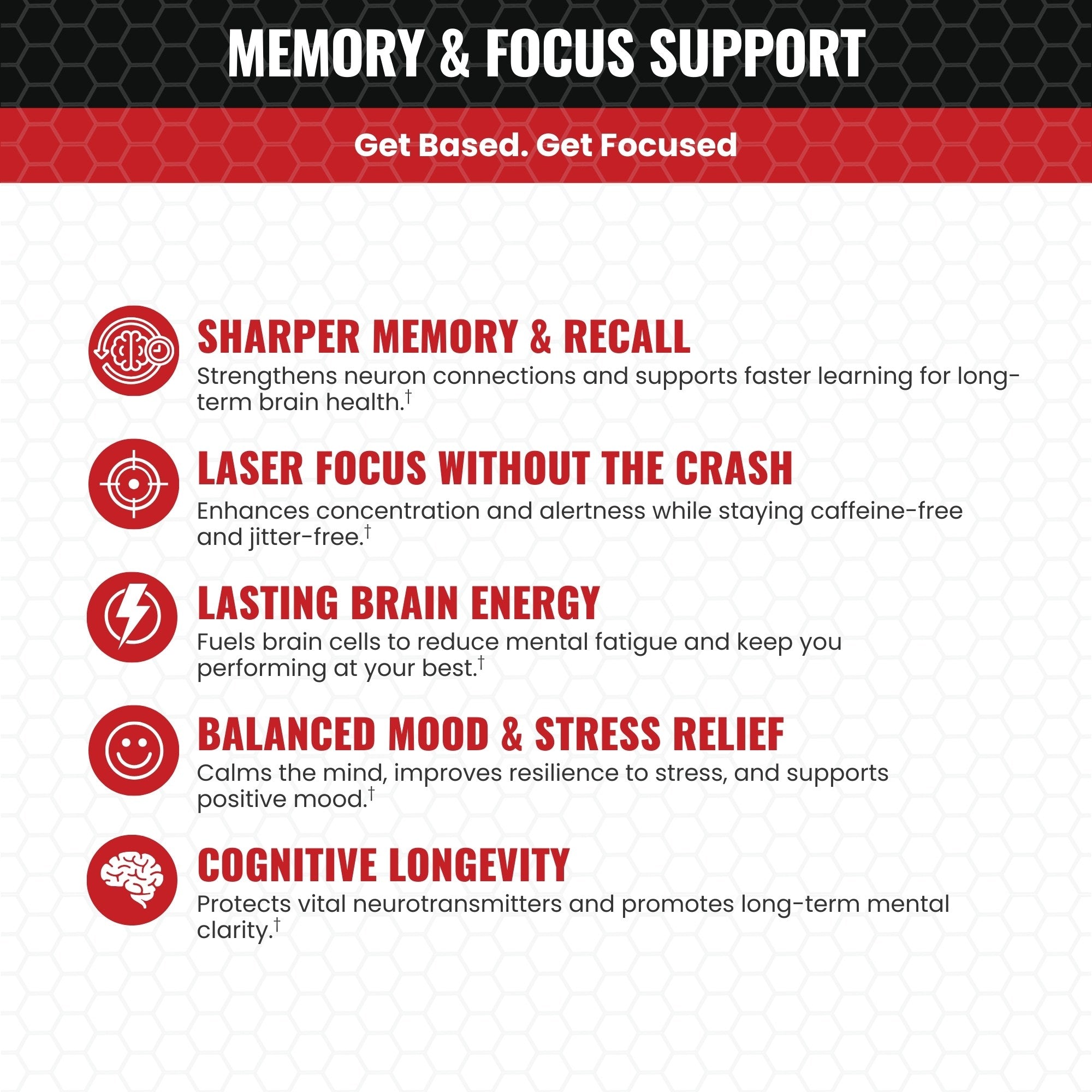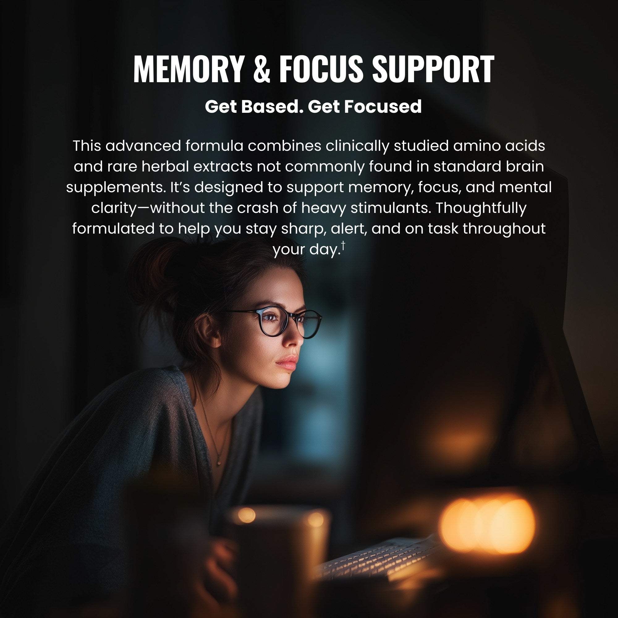 Memory & Focus Support is a nootropic stack that combines clinically studied amino acids, adaptogens, and brain-boosting botanicals to help you stay clear, energized, and composed—without the crash.† Whether you’re working, studying, or just trying to stay on top of life, this advanced formula helps support your cognitive edge.†