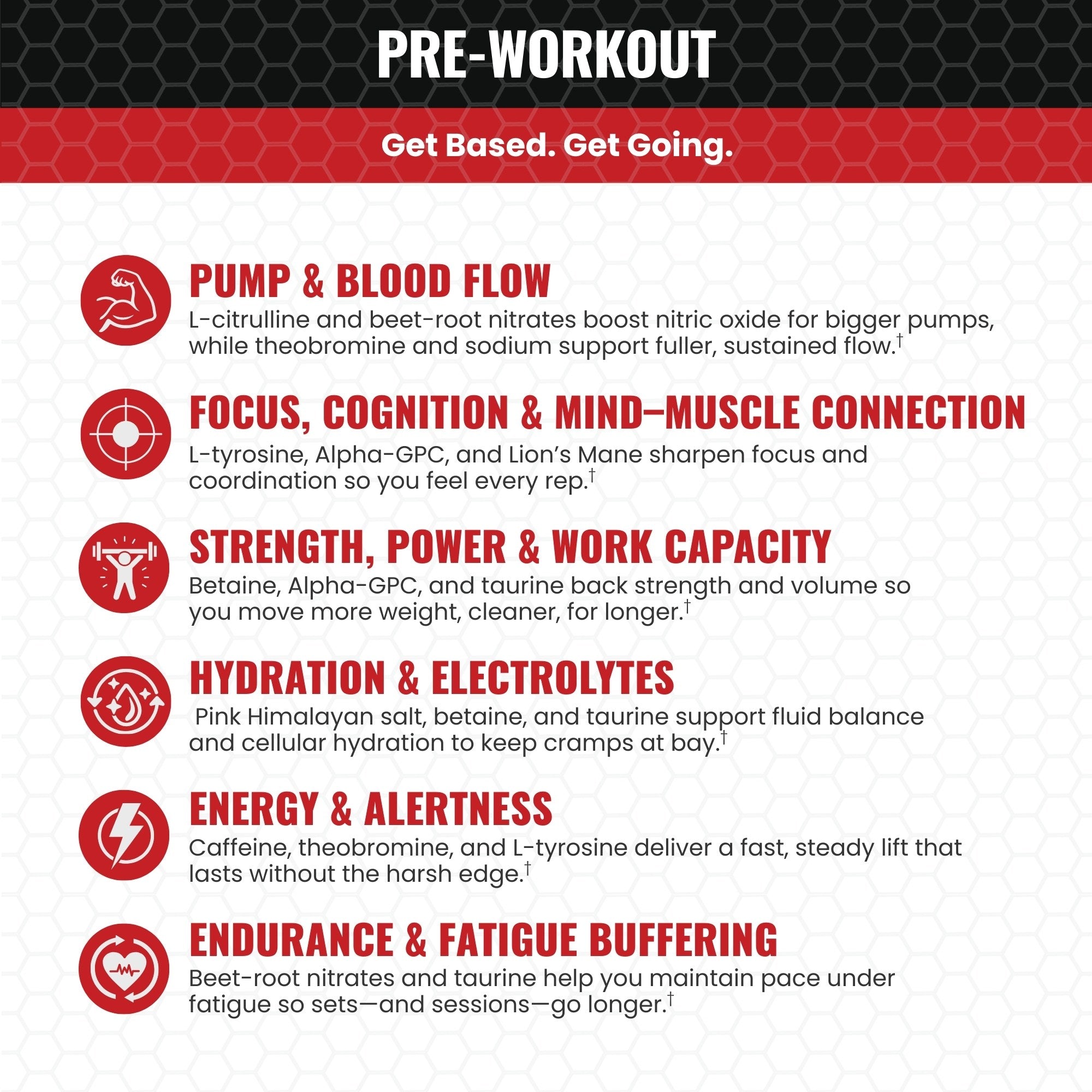 Strength & Power – Betaine and Alpha GPC boost power output, coordination, and volume under fatigue.†