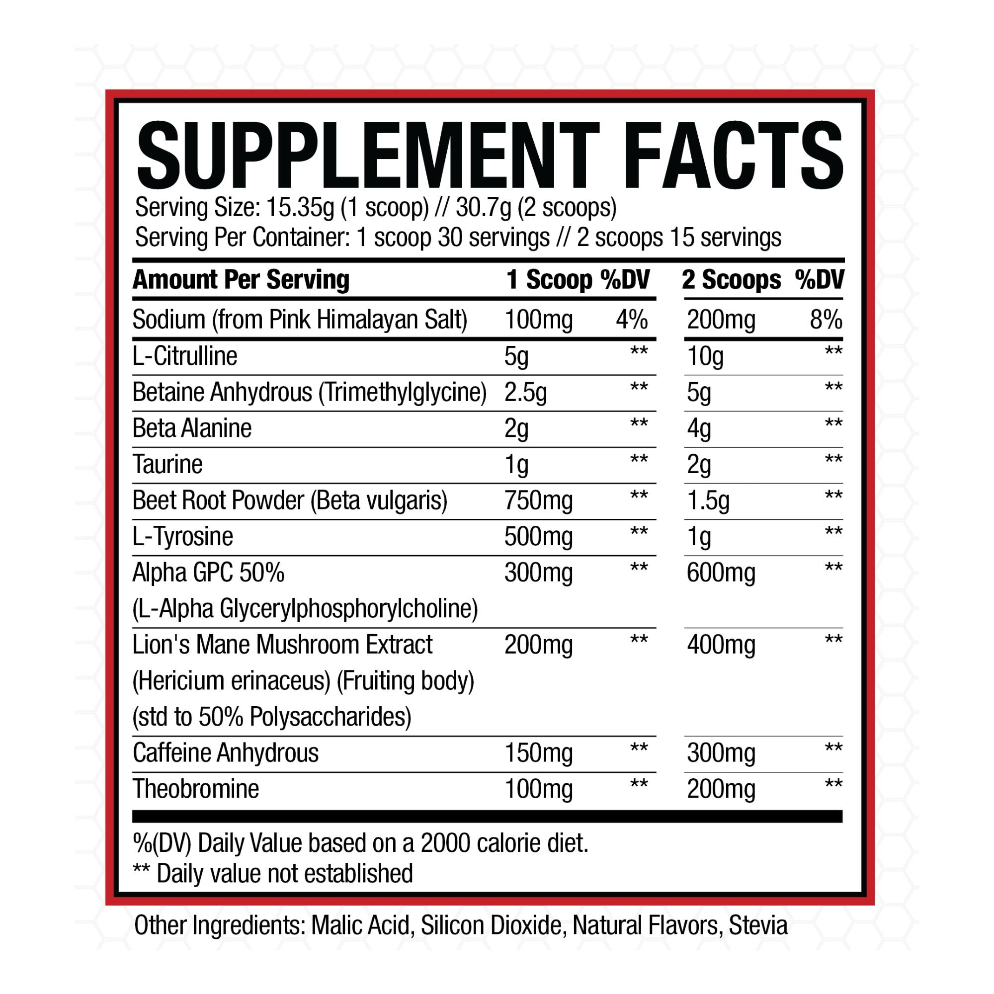 Pump & Blood Flow – L-Citrulline, Beet Root, and Theobromine increase nitric oxide and circulation for stronger pumps and nutrient delivery.†