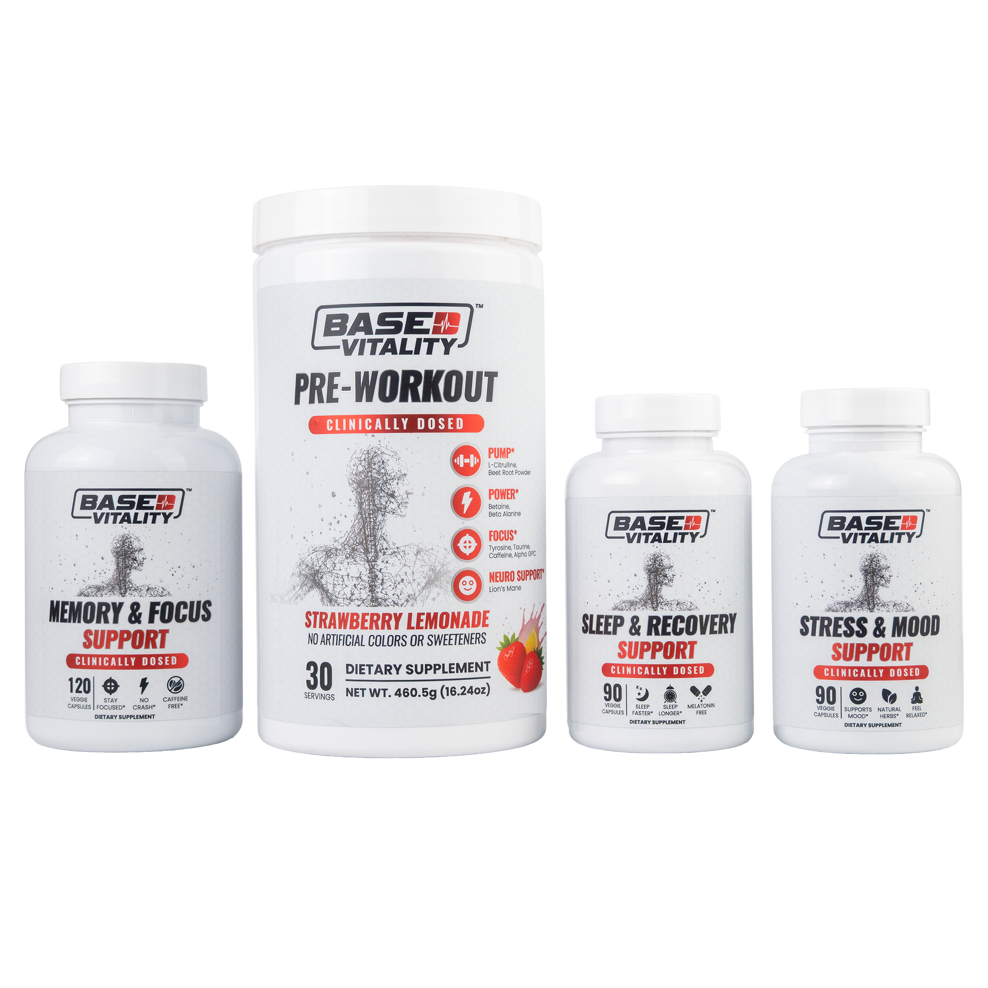 The Starter Pack is your “full-day system” for performance, focus, stress resilience, and recovery—built from four core Based Vitality formulas designed to work with your routine, not fight it.